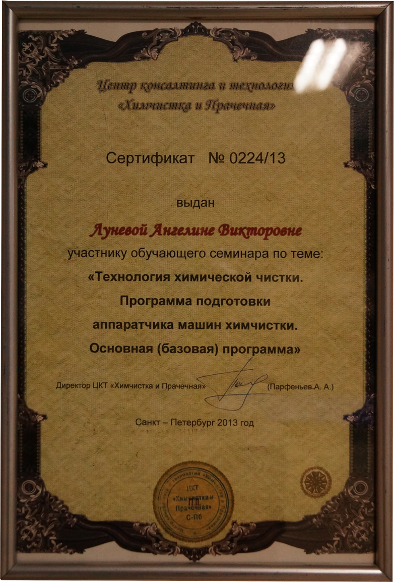 Оснащение современным европейским оборудованием (SUPREMA, VIET, IPSO, PONY, Electrolux), использование химических препаратов ведущих европейских производителей (BUFA, SEITZ, KREUSSLER, Alberti Angelo), дающих наибольший эффект чистки и обладающих экологической безопасностью, позволяют работать с вещами любой сложности. Мастер-классы, семинары и тренинги по химической чистке, аквачистке, крашению  и контролю качества лучших технологов