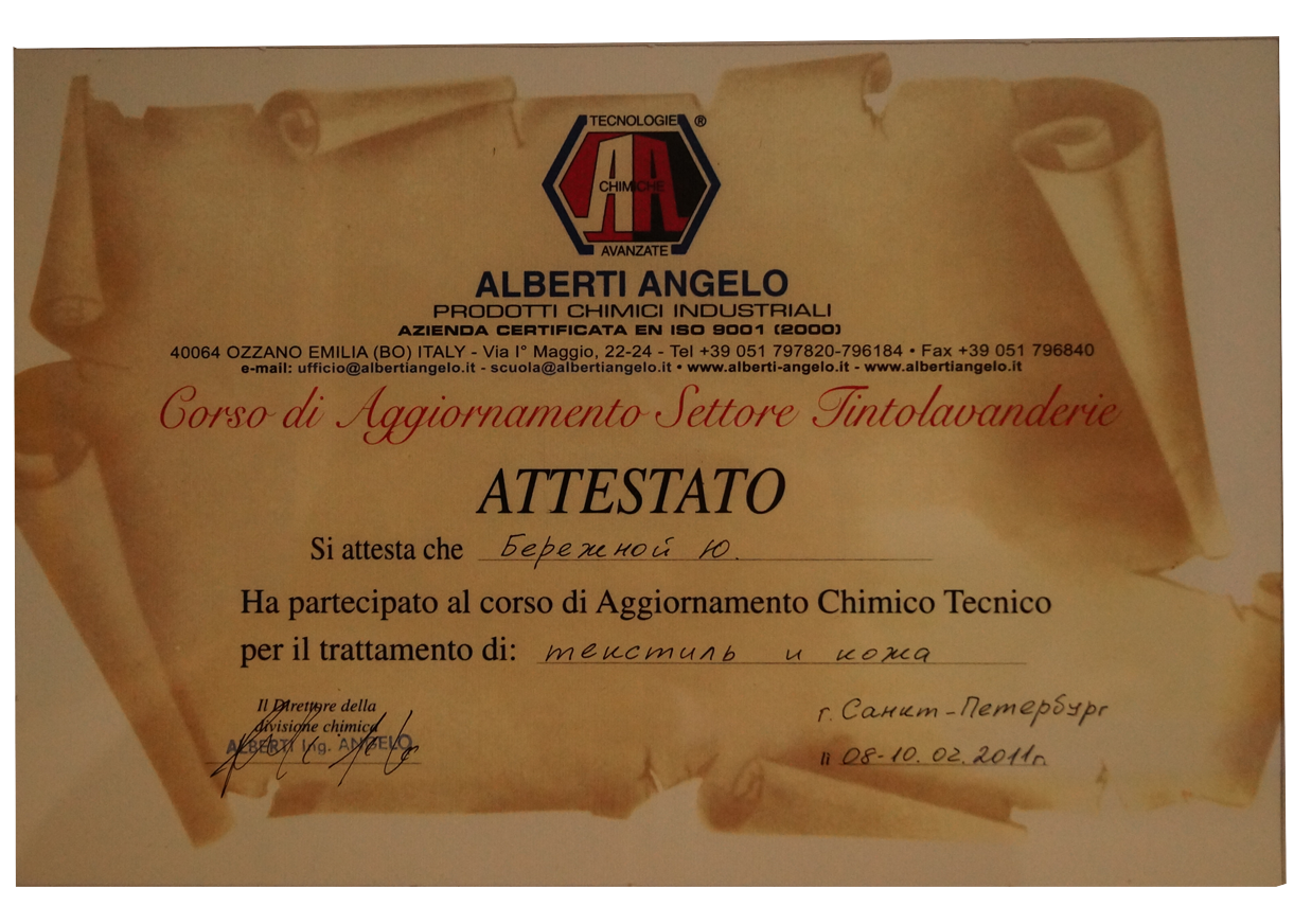 Оснащение современным европейским оборудованием (SUPREMA, VIET, IPSO, PONY, Electrolux), использование химических препаратов ведущих европейских производителей (BUFA, SEITZ, KREUSSLER, Alberti Angelo), дающих наибольший эффект чистки и обладающих экологической безопасностью, позволяют работать с вещами любой сложности. Мастер-классы, семинары и тренинги по химической чистке, аквачистке, крашению  и контролю качества лучших технологов